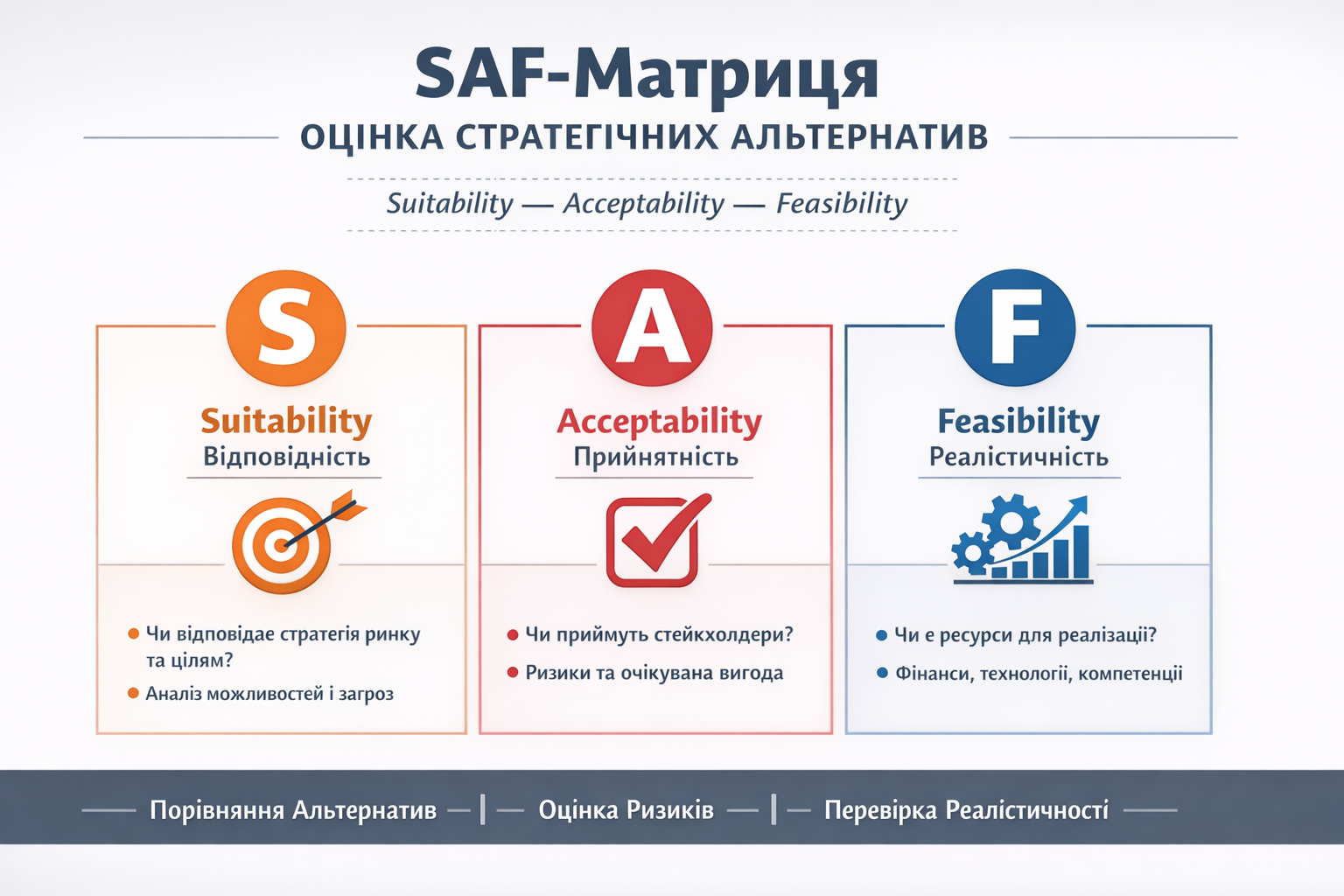 - Feasibility (реалістичність) — чи має організація ресурси, компетенції та можливості для реалізації цієї стратегії.